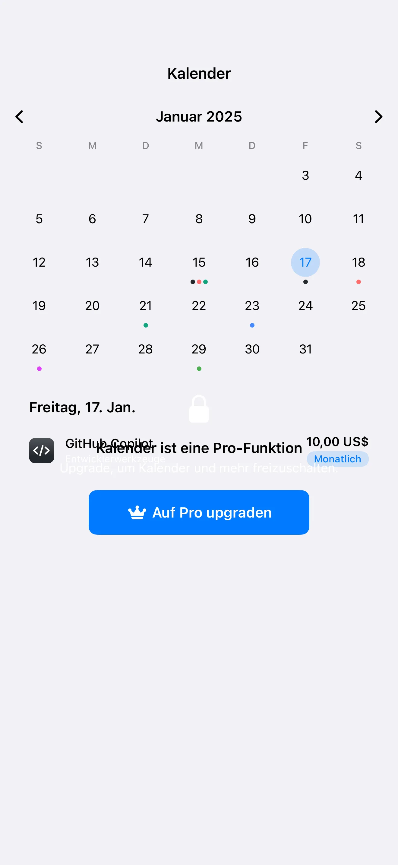 Visueller Kalender mit anstehenden Zahlungen. Plane deine Ausgaben wochenweise.