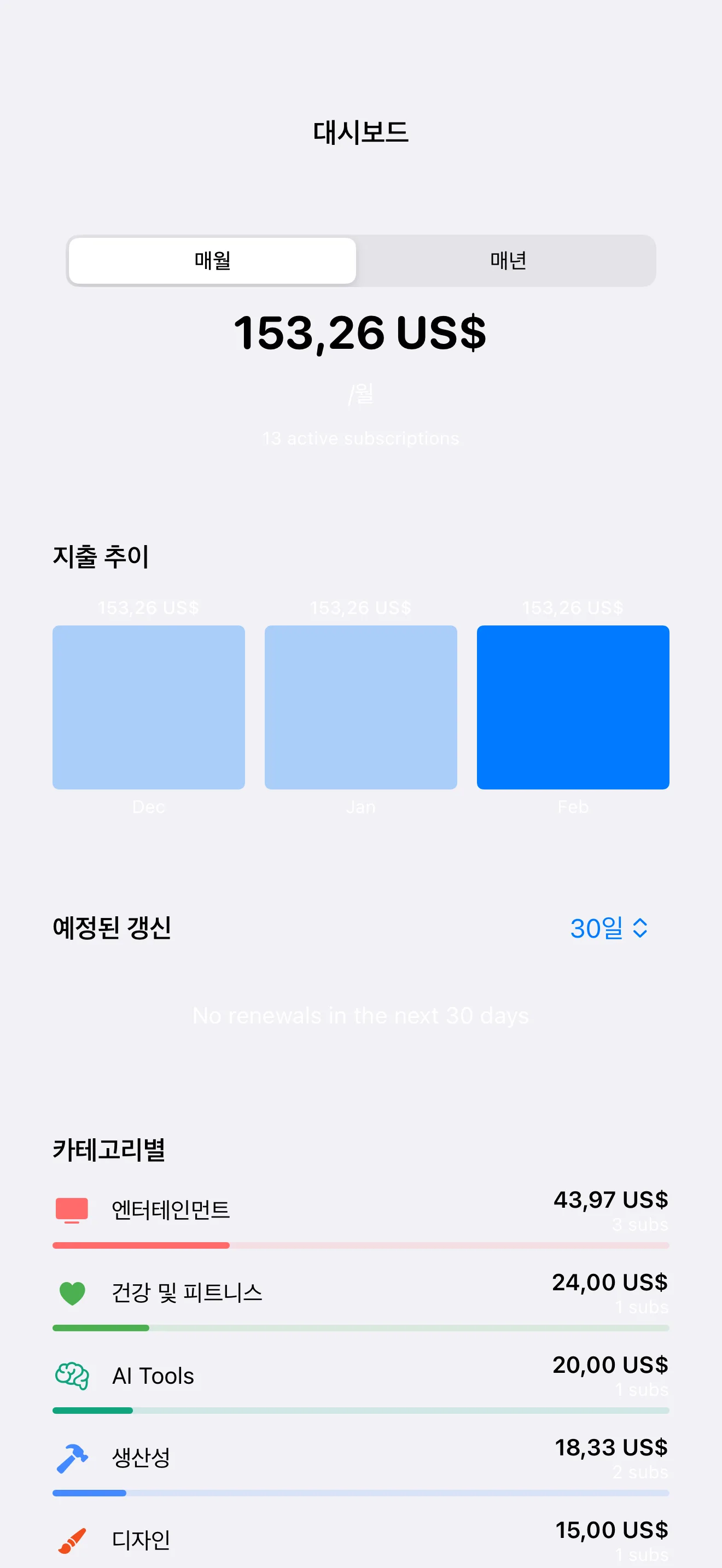 모든 구독을 한눈에 확인. 월별·연별 지출 분석과 트렌드 분석.