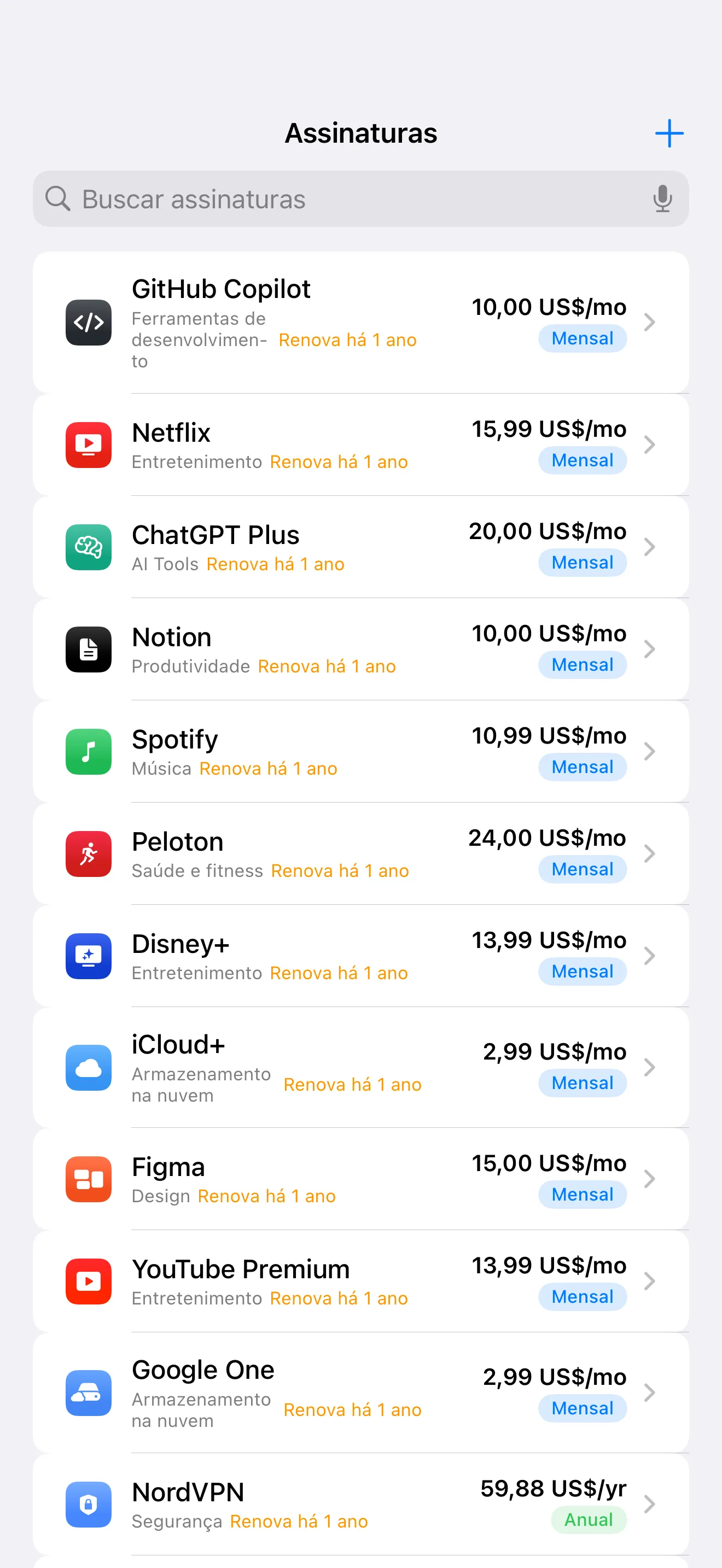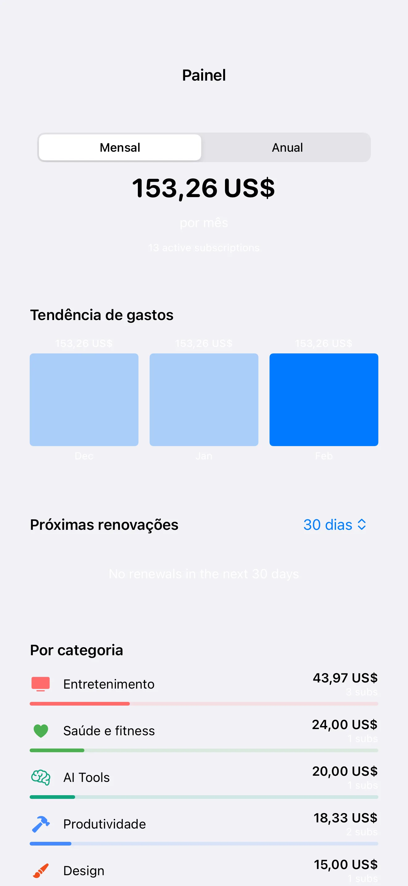 Todas as assinaturas em um relance. Gastos mensais e anuais com análise de tendências.